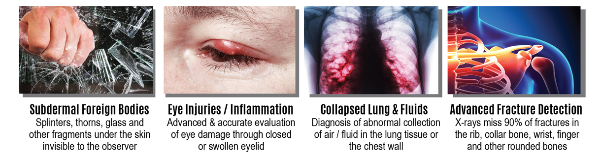 shoulder, fingers and ankle missed by conventional x-rays may be detected. Stress fractures and shin splints show up 2 weeks earlier than on regular x-rays. Targeted scans detect five times as many rib fractures as conventional radiographs.