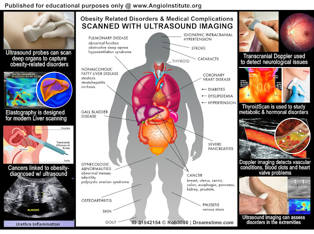 Obesity is a long-term health condition impacting more than a billion people worldwide, with numbers rising steadily due to modern dietary patterns, low physical activity, genetics, and environmental influences. Beyond visible weight gain, obesity disrupts nearly every organ system, triggering widespread complications that shorten lifespan and degrade quality of life. These include cardiovascular problems, type 2 diabetes, liver damage, hormonal and neurological disturbances, certain cancers, and musculoskeletal disorders. While traditional diagnostic approaches often involve invasive procedures or costly imaging scans, ultrasound technology has become an essential, safe, and highly adaptable method for evaluating obesity-related diseases. The poster provided illustrates how ultrasound can scan multiple organ systems affected by excess weight, supporting early detection, risk evaluation, and targeted treatment planning.