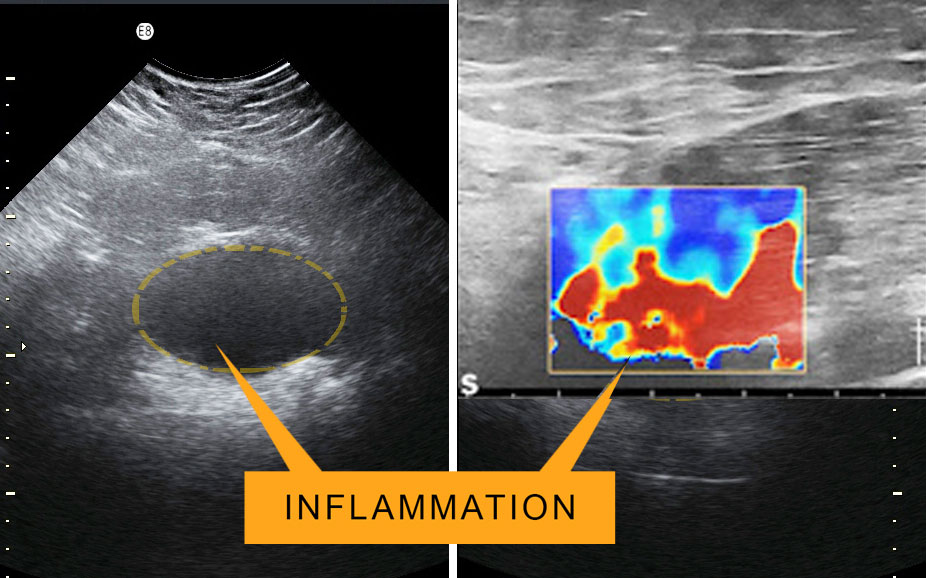 TRAUMA: Soft tissue trauma causes a black and blue area but subcutaneous pathology is best imaged by ultrasound FIG 2 The normal dermal layer is light gray on scans while inflammation is dark gray and fluid (blood) is black. Dermal ultrasound has been used for 30+ years to find skin cancer and guide scar treatment so the use in subacute trauma victims is a logical progression of this portable and non invasive technology.